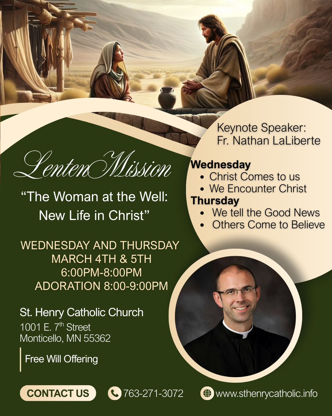 Join us from 6:00 PM - 8:00 PM for the Lenten Mission on Wednesday and Thursday, March 4th and 5th. Keynote speaker Father Nathan LaLiberte will speak on "The Woman at the Well: New Life in Christ." Adoration to follow!