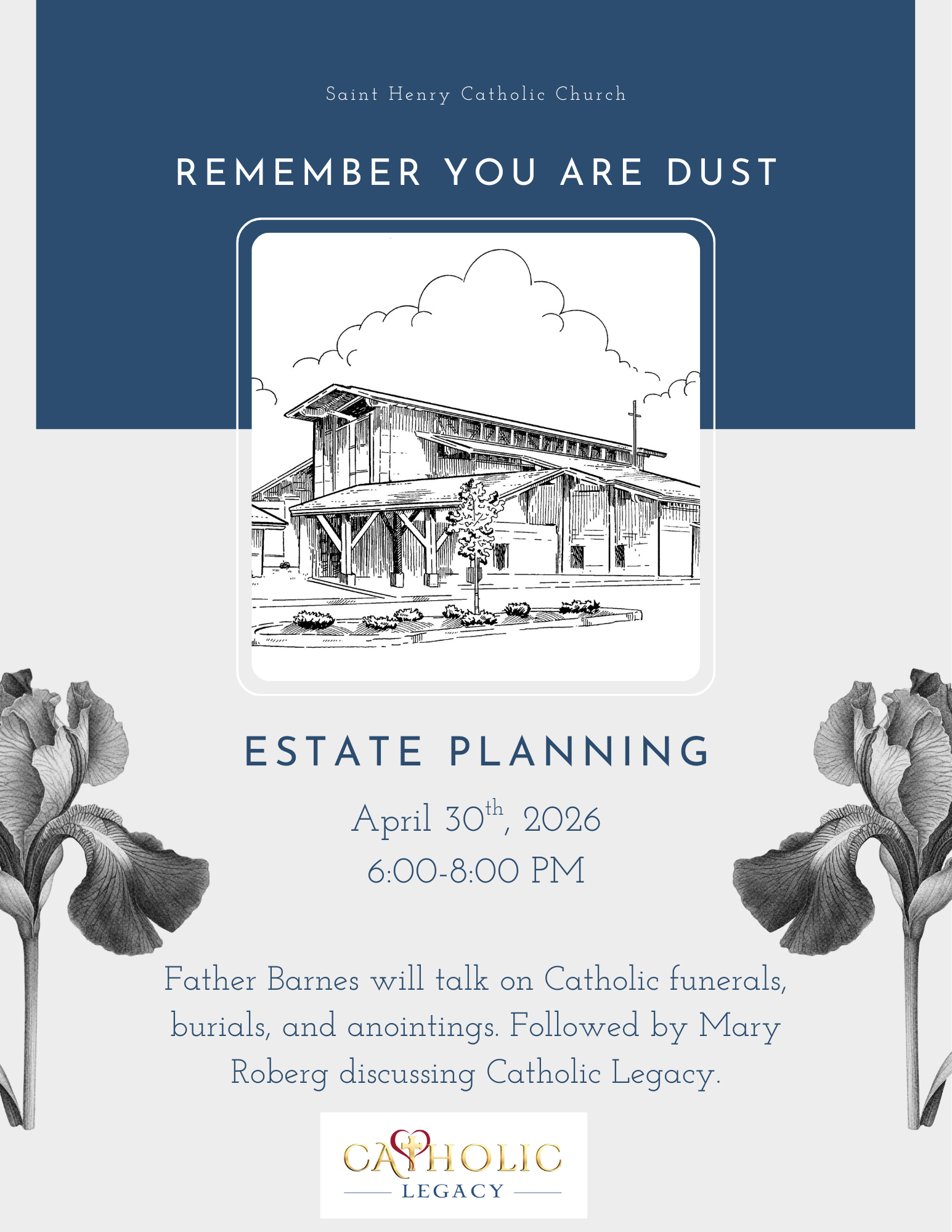 Father Barnes will speak on the topic of Catholic funerals, burials, and anointings. Mary Roberg will discuss Catholic Legacy. Remember You are Dust Seminar will be held in the social hall.