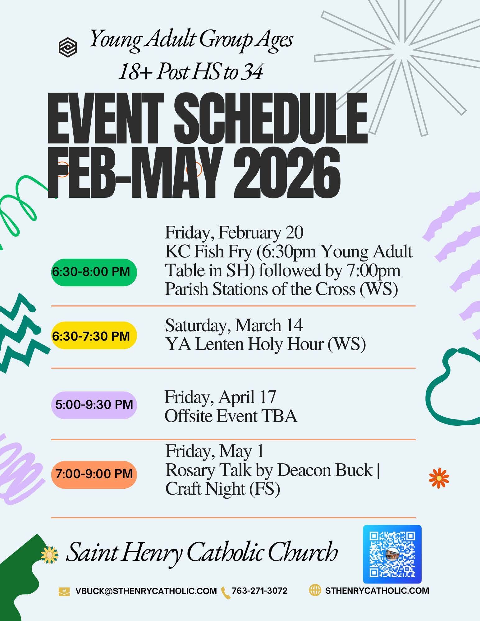 All 18 (post highschool) to 34 yr olds are invited for faith, friendship, and prayer. See the flyer for all dates!