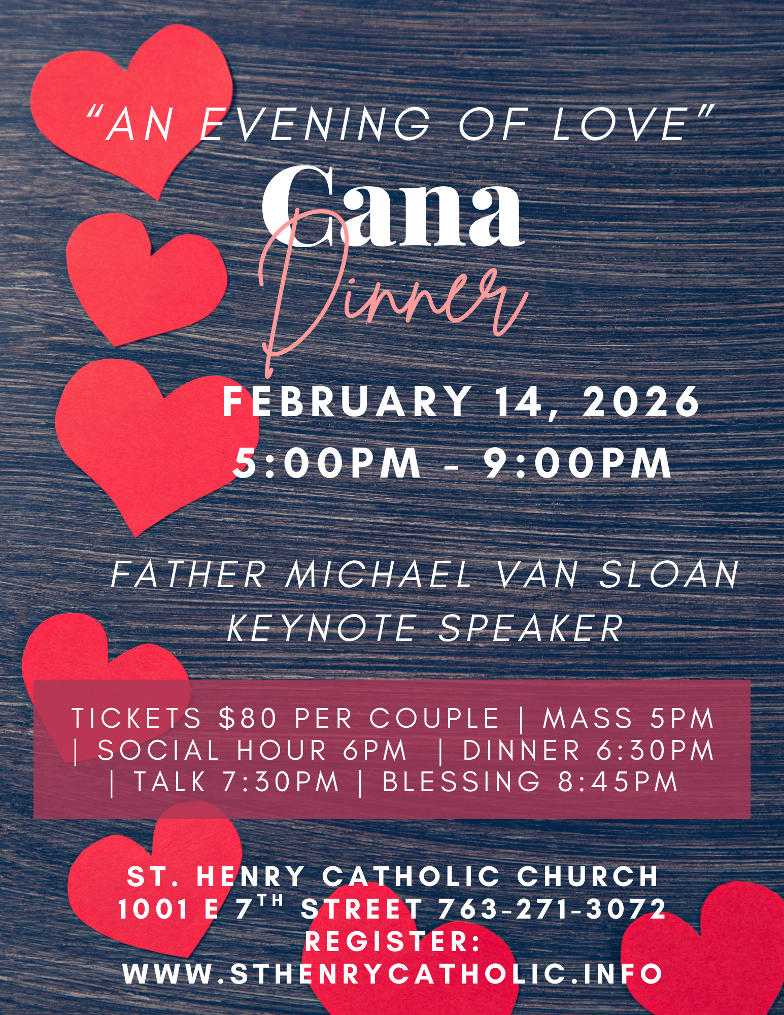 Join us for the Cana Dinner on Saturday, February 14th! This will be a joyous evening of fellowship, love, and inspiration! Join us for drinks, dinner, a talk by Father Michael Van Sloan, and a marriage blessing. Celebrate your marriage with an evening designed to nourish your relationship and your faith! Inspired by the Wedding at Cana, this special event offers married couples a chance to reconnect, reflect, and strengthen their bond in a supportive, faith-filled community.