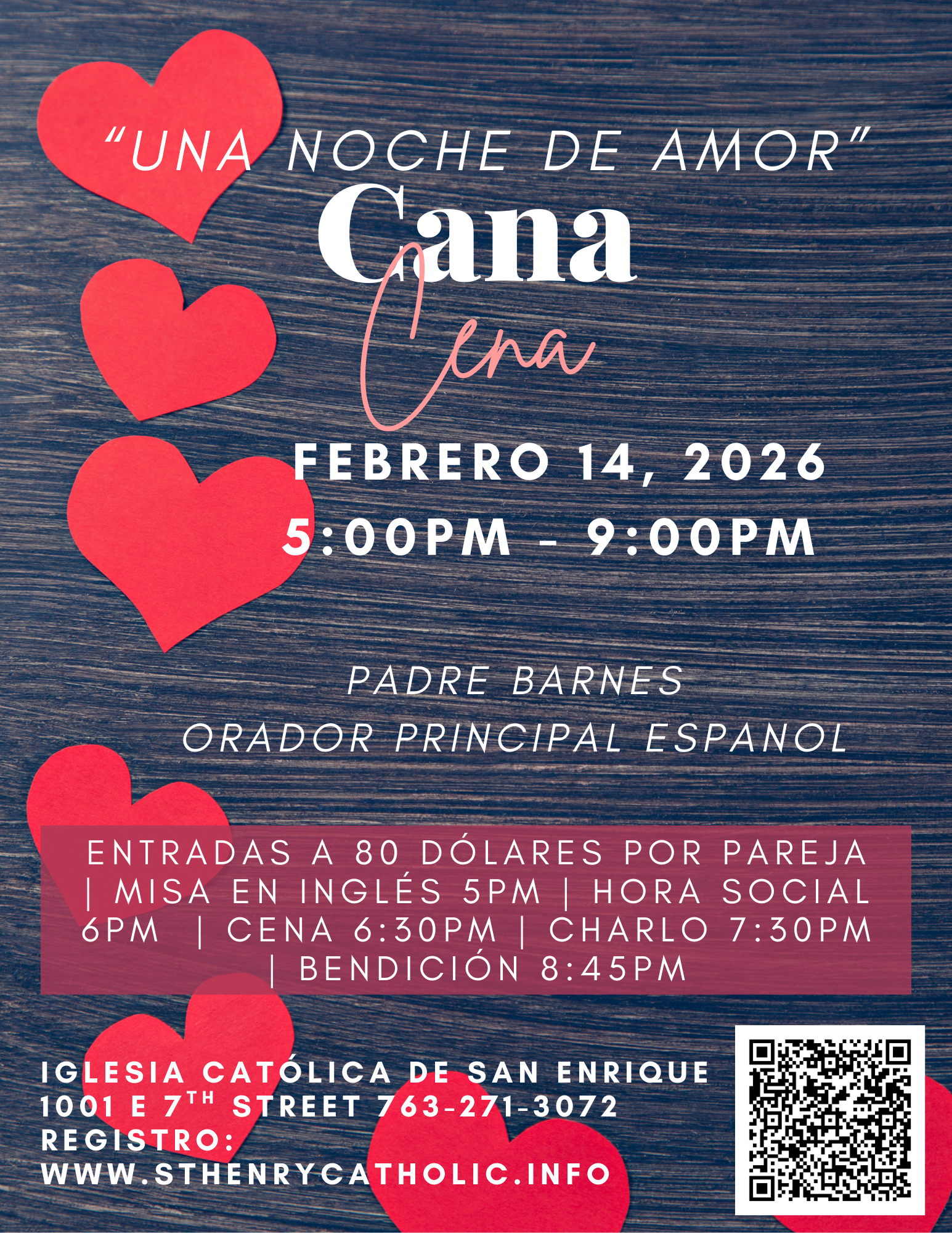 ¡Únase a nosotros para la Cena de Caná el sábado 14 de febrero! ¡Será una noche maravillosa de compañerismo, amor e inspiración! Disfrute de bebidas, cena, una charla del Padre Barnes y una bendición matrimonial. ¡Celebre su matrimonio con una velada diseñada para nutrir su relación y su fe! Inspirado en las Bodas de Caná, este evento especial ofrece a las parejas casadas la oportunidad de reconectarse, reflexionar y fortalecer su vínculo en una comunidad solidaria y llena de fe.