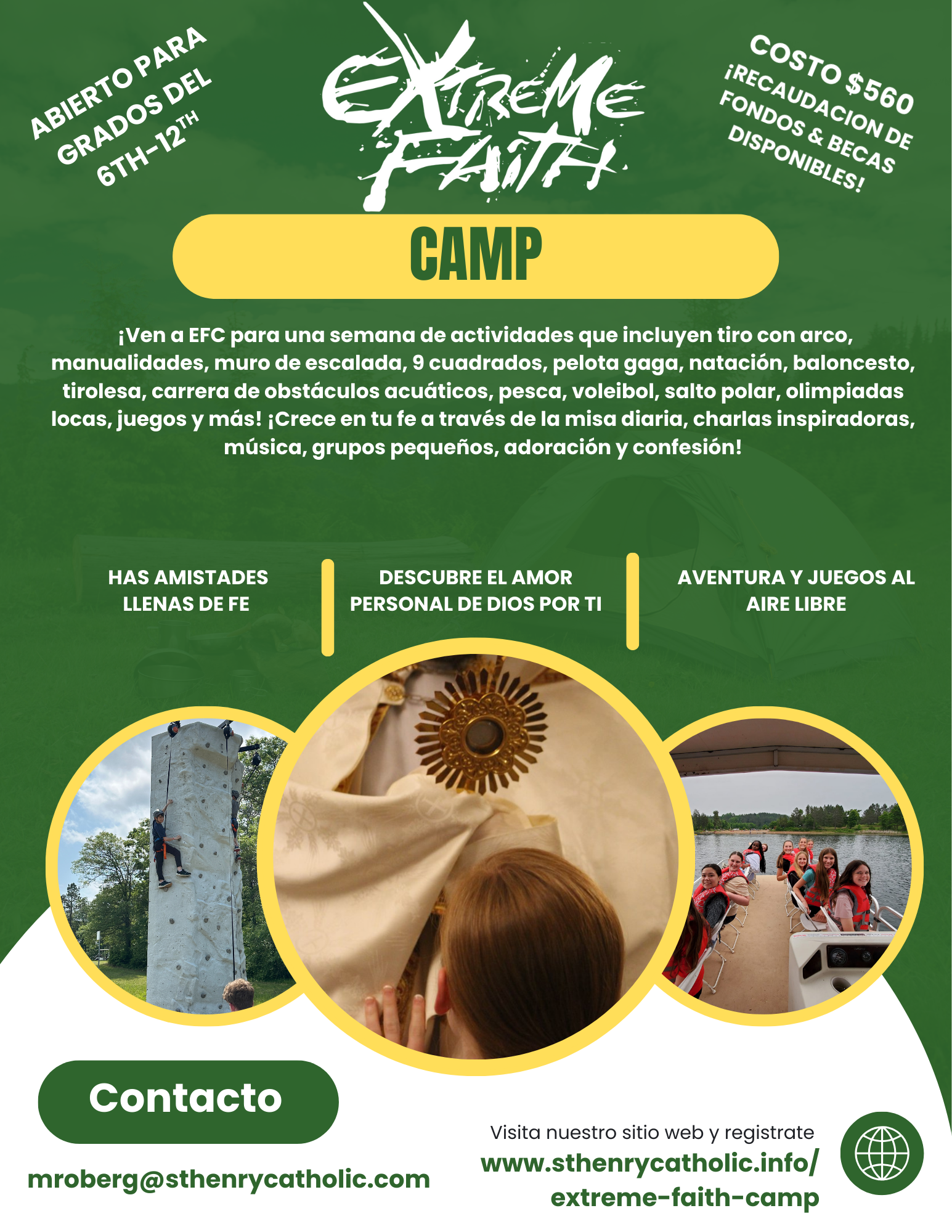 What is Extreme Faith Camp? Extreme Faith Camp is a high adventure camp located in Trego, Wisconsin. Camp is packed with incredible activities: swimming, volleyball, pickleball, canoeing, fishing, zipline, climbing wall, wacky olympics, 9-square, water obstacle course, flying squirrel, crafts, & more! Extreme Faith Camp is integrated closely with our parishes from the Archdiocese and is led by parish youth ministers, parent chaperones, young adult and high-school leaders, guaranteeing that summer camp is not just a mountaintop faith experience, but one that builds lifelong foundations of faith. Our faith programming is founded in the sacramental life of the Catholic Church, and our mission and work is anything but boring. Camp includes daily Mass, inspiring talks, music, small group discussion, Adoration, Confession, & more!